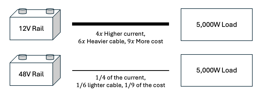 - Same Power with Lower Current - By increasing voltage, the same amount of electrical power can be delivered with a smaller amount of current. (For example, a 1 kW electrical load powered by 12V needs 83 amps to be delivered. At 48V the same electrical load current requirements drop to just under 21 amps.)