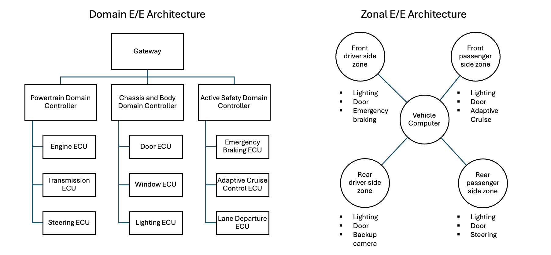 Whereas domain architecture had dedicated controllers for controlling lights, which resided in one location on the vehicle and then ran all wiring through a dedicated fuse box (solving the problem with lots of wiring). Zonal architecture decentralizes a function like lighting, allowing multiple zone controllers to take on that task. Likewise, eFuses decentralize the dedicated fuse box, and in turn significantly reduces the amount of wiring used.