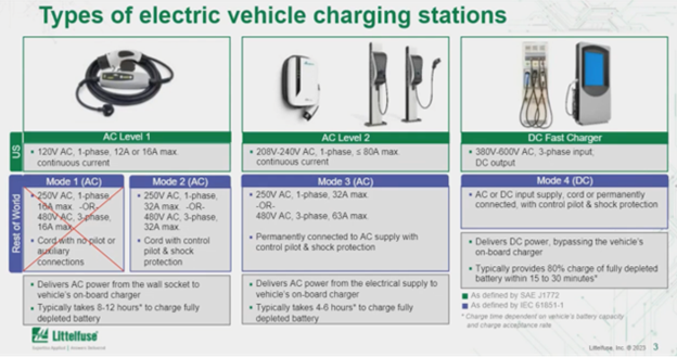 - Level 3 – Direct Current (DC) charging, "fast chargers". Direct Current Fast Charging are the highest power and fastest EV charging stations. While they can nearly charge a battery in less than 1 hour, they require an enormous amount of power to do so. Most Direct Current Fast Charging stations require at least 480 Volts and 100 amps, but some newer stations have the ability of 1000 Volts and 500 amps of electrical power. As such DC fast charging stations are commonly found only in public areas, such as rest areas or near shopping malls.