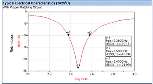 Figure 1: Typical frequency performance of the 2450AT43B100E chip antenna. (Image courtesy of Johanson Technology)
