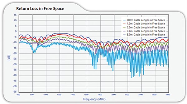 These graphs show the same antenna with 30 cm, 1 m, 2 m, 3 m, and 5 m cable lengths and their respective return losses. As can be seen, the 30 cm antenna is going to have the lowest return loss. This does not mean that longer is better, but rather that for the given frequencies this antenna was meant to handle, the extra length gets us closer to the purely resistive part of the Smith Chart. We ultimately want to remove as much capacitance and inductance as possible from our transmission line and having the accurate length of line greatly effects this.