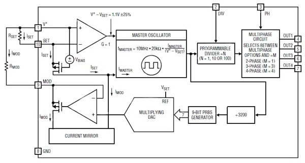 Figure 3: The LTC6902 clock oscillator from Linear Technology Corp is specifically designed for single and multiphase supplies; note the 9-bit pseudorandom sequence generator that drives a DAC, which in turn controls the clock frequency.