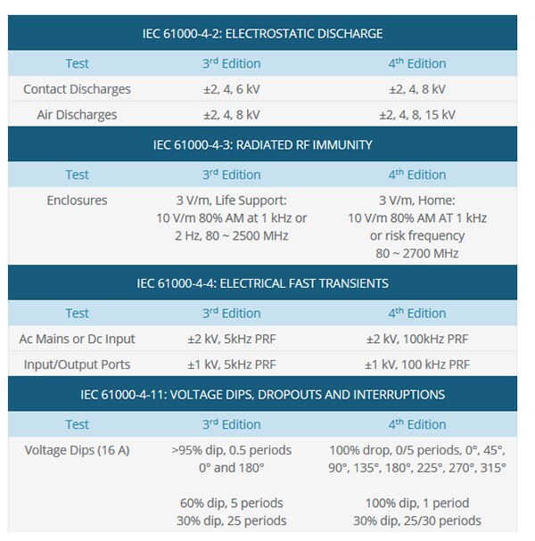 Table 1: Key changes to immunity test levels from 3rd edition to 4th edition of IEC 60601-1-2. (Table source: CUI Inc.)