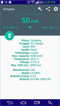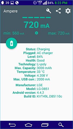 Okay, time to do some experimenting. I found an app for my Android called “Ampere” that displays the battery current draw when unplugged, and the charging current when plugged in. I took my favorite heavy-duty USB cable and repurposed it to charging my phone again. The charging current shown was a healthy 720 milliamps (mA), almost the same as the rated capacity as the AC adapter (Figure 1).