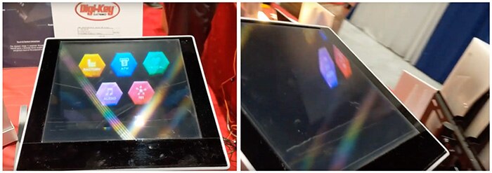 Figure 1: Neonode’s demo projected a holographic image from a display to a point in space about 5 inches above the surface of the demo box. Viewed from the front, it looks like a regular control panel interface (left); viewed horizontally, the control panel disappears (right). (Image source: TechWire International)