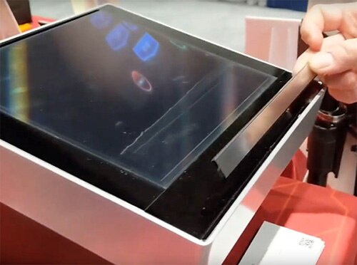 Figure 3: A strip of zForce AIR measuring approximately 8 inches is embedded into the demo box at an angle to detect objects in a space approximately 8 inches above the screen. This strip consumes 146 mW. (Image source: TechWire International)