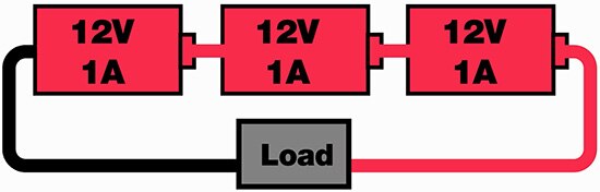 If you are hooking batteries up in series, connect the positive terminal of one to the negative of the next, and so on. The following formula applies to series circuits: (Vtotal = V1+V2 etc.). This will provide you with extra voltage for the load, but no extra current (Itotal = I1 = I2 etc.). The series example shown in Figure 1 works out to be 36 V with a 1 A current capacity.