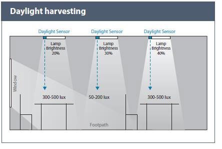 Energy savings is very important in our lives—why use more when you don’t have to? With smart lighting, light fixtures will vary their intensity to maintain specific space lighting levels per the natural light that is coming in from windows. The chart below shows a great example of three lights; as the fixtures’ locations get closer to the window, the light intensity is reduced. These fixtures will also change intensity during the course of the day if it is becoming evening or during weather events like rain storms. All this is done automatically, though, being IoT ready, the lights can be controlled remotely if needed.