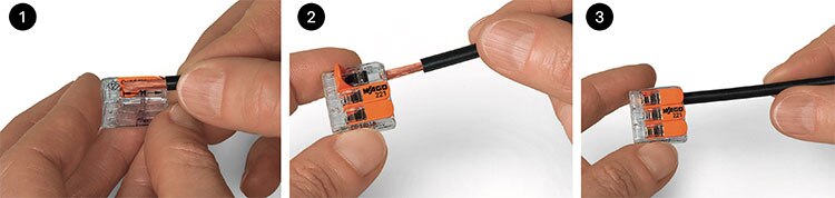 The basic operating principles of the LEVER-NUTS are shown (Figure 1) using the three-position 221-413/K194-4045. First, strip the wire as indicated on the terminal housing (11 to 14 mm, or about 0.5 inches (in.)). Second, pull up one of the orange levers to open a clamping unit. Third, insert the wire and push the lever back down.