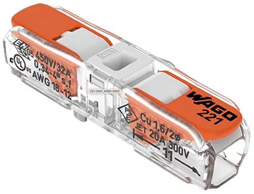 Figure 3: The 221-2401 inline splice connector can extend lines or provide a temporary connection. (Image source: WAGO)