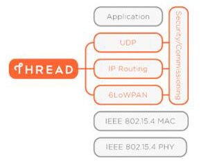 Another strength of Mesh topology is if a parent/router/leader fails, it will dynamically promote a new parent. Per Digi “Another Key advantage of Thread is that the application layer is separated from the actual Thread stack, making it agnostic and flexible...” See figure below. The frequency and technology are the same as what is used for Zigbee, so many companies are transitioning their current devices to work with Thread.