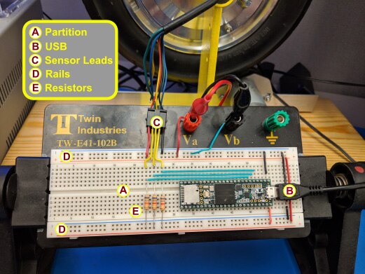Using a breadboard (438-1045-ND or similar), position the Teensy 3.5 with the USB connector to the right and the upper header pins inserted into the first row of breadboard holes above the partition (Figure 2). This will allow room for connection of the sensor outputs to the Teensy I/O.