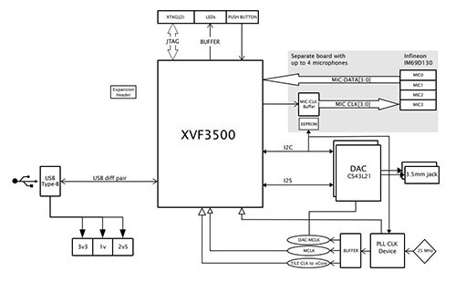 Figure 2: VocalFusion Stereo Dev Kit Block Diagram. (Image source: XMOS)