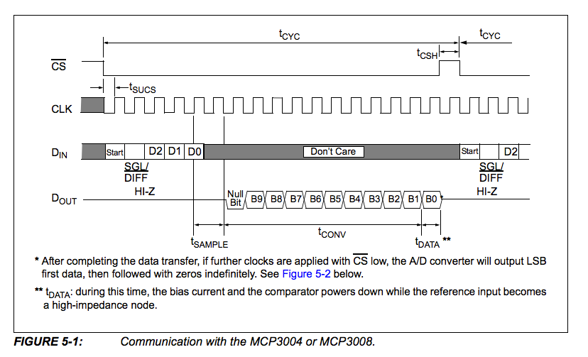 We used an MCP3008 to do the analog-to-digital conversion. It is an 8-channel, 10-bit analog-to-digital converter. ‘8 channel’ means that it can accept up to 8 different analog voltages. The 10-bit property is the resolution of the ADC, or the precision to which it can measure a voltage. Since the SPI library was broken, we had to implement it from scratch using bitbanging.