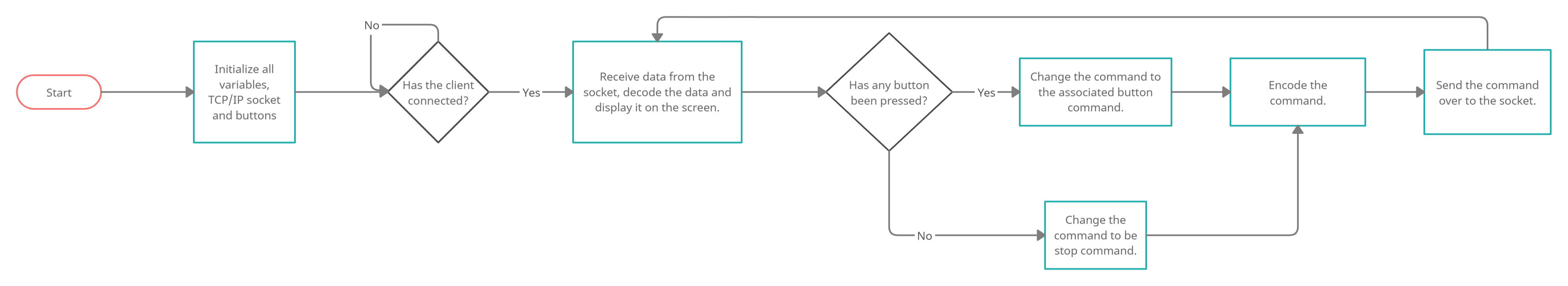 All these different data values are semi-colon (";") delimited and the values in the same data array are comma (",") delimited. All these data points are appended in a single string. The string is then encoded and sent over the TCP/IP socket. After sending the data, the server then waits for the commands from the client in a blocking manner. Once a string is received, the server decodes the string and changes the functions as per the received command.