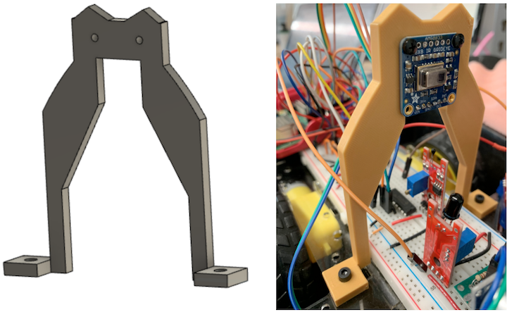 To get a live feed of our surroundings, we used the Adafruit AMG8833 IR Thermal Camera. This camera module has 12 pins, out of which we only used 4. To get data from the camera, we used the I2C communication protocol. We also needed to install the "adafruit_amg88xx" library to use the module. Once running, the module returns an array of 64 individual infrared temperature readings over I2C. This module can measure temperatures ranging from 0°C to 80°C with an accuracy of ± 2.5°C making it ideal for our application. It can also detect a human from a distance of up to 7 meters. In order to get an image from the 8x8 array, we used image processing using the SciPy python library to interpolate the 8x8 grid. Additionally, Fusion 360 was used as a computer aided design (CAD) tool to create an owl shape mechanical mounting bracket to mount the IR camera securely and enhance the aesthetic of the robot.