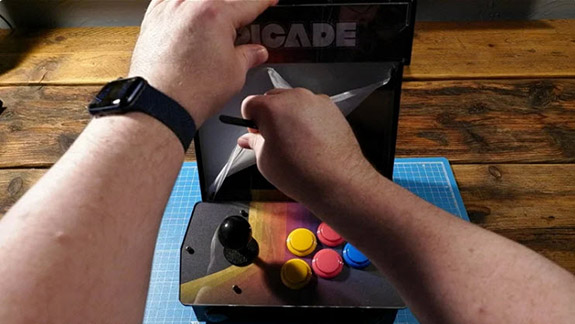 A little masking tape or a rubber band can help to hold the marquee sandwich together (you’ll be able to peel it off easily later). Slot this piece into place into the slots at the top and front of the cabinet, with the PICADE text facing forward. Make sure to keep an eye on the screen assembly while you do this as it might fall out of its slots - another pair of hands might be useful for this bit.