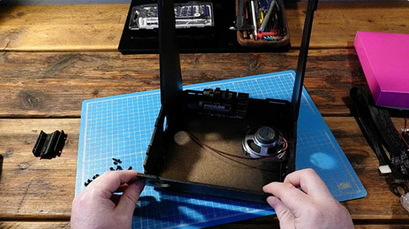 Place the speaker on the label side of panel A, with the paper cone against the cutouts and the wire pointing towards the edge of the Picade. Secure it with M3 screws, pushed through from the good side, and M3 nuts. The paper cone of the speaker is delicate, so take care not to accidentally damage it.