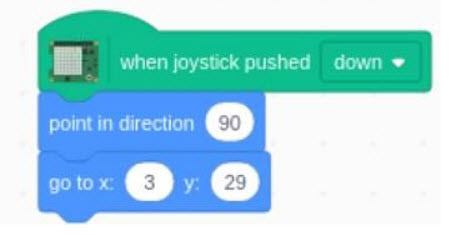 Within the code structure, there is a conditional statement that looks for the ‎joystick being pushed upward by the player. When the joystick is pushed upward, ‎the cat will move and turn in a 10-step, - 90˚, and 30-step sequence. The code ‎used for checking the joystick position and sequencing the Scratch cat movements ‎is captured within a loop. The loop will run continuously until the player clicks the ‎on-screen red stop sign. ‎