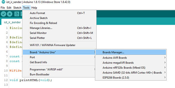 Once you have finished that step, open the board manager window and search for ESP8266 just like you did with the two libraries. You can access the board manager from the main menu bar of the Arduino IDE: