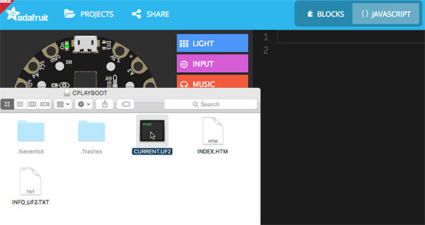 - Find the .uf2 file generated by MakeCode in your file explorer. Copy it to the "CPLAYBOOT" volume.