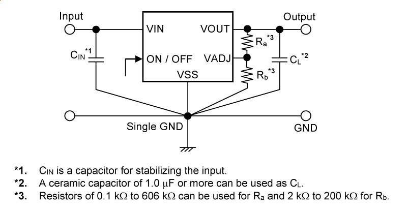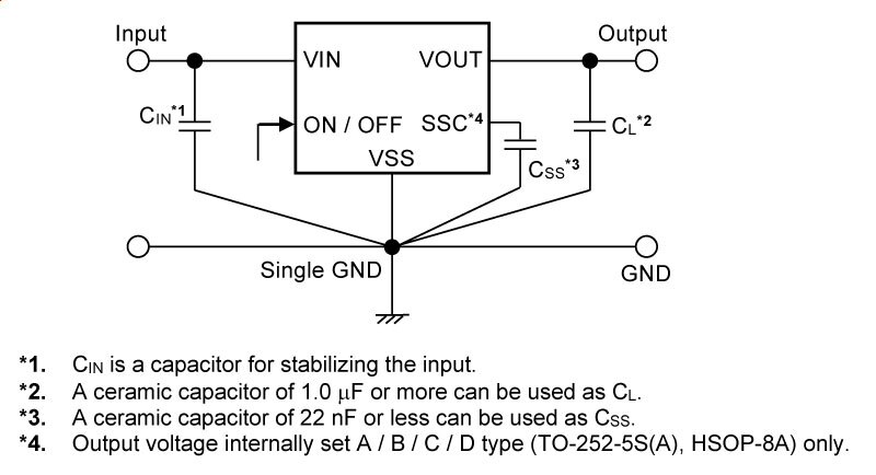 - Input and output capacitors: a ceramic capacitor of 1.0 µF or more can be used