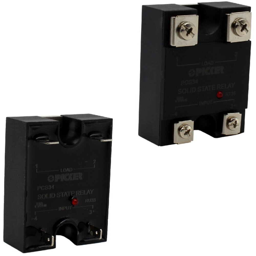 The CIT Relay and Switch Picker Components PCS34 AC input series solid state relay delivers high power performance in a lightweight, compact design. With control voltages up to 280 VAC and load handling up to 600 VAC, the PCS34 is built for demanding applications. Offering rugged reliability with standard LED status indication, it provides flexible zero-crossing or random turn-on switching and a choice of quick connect or screw terminals for easy installation. The PCS34 is an excellent solution for industrial automation, motor control, heating systems, and power management applications.