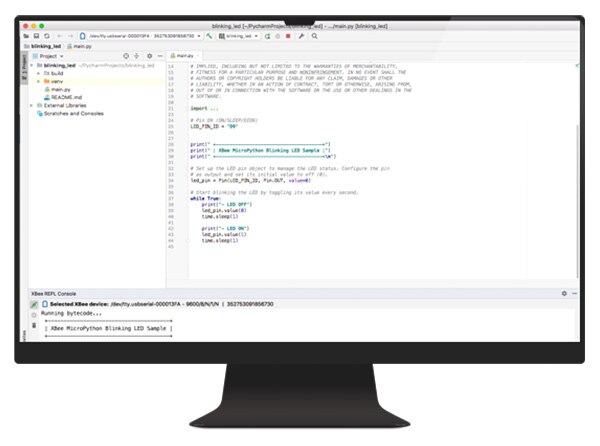 The Digi XBee® MicroPython PyCharm Plugin allows developers to write, compile and run MicroPython applications for Digi XBee devices in an efficient and user-friendly manner. With PyCharm and the plugin you can create MycroPython projects from scratch or edit an existing example provided with the utility. Thanks to its syntax highlight feature, quick documentation and code completion features, witting developing your application has never been easier. You can also add libraries to use external peripherals or non-standard APIs and talk with your Digi XBee using the REPL console for application outputs or execute commands.
