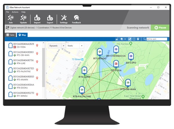 Used in conjunction with XCTU, The Digi XBee® Network Assistant is a free tool from Digi designed to inspect and manage radio frequency (RF) networks. Enjoy features like the ability to geo-locate your network devices or place them in custom maps and get information about them. Join and inspect any nearby Digi XBee network to get detailed information about all the nodes it contains. Update the configuration of all the nodes of the network, specific groups, or single devices based on configuration profiles, and export the network you are inspecting and import it later to continue working or work offline.