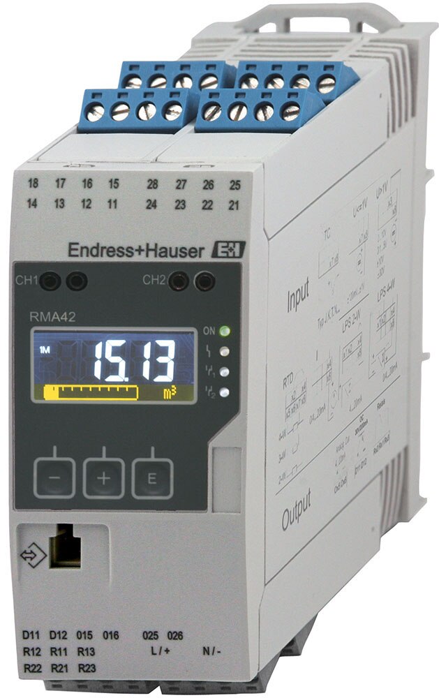 Endress+Hauser's RMA42 universal process transmitters are ideal for displaying analog measured values. The integrated loop power supply can power two-wire sensors. The universal inputs connect current, voltage, RTDs, and TCs. RMA42 transmitters feature a multicolor LCD with a seven-segment bar graph. These devices cover many functions and applications, including loop power supplies, barriers, integrated relays, calculations, and an indication of measured values.