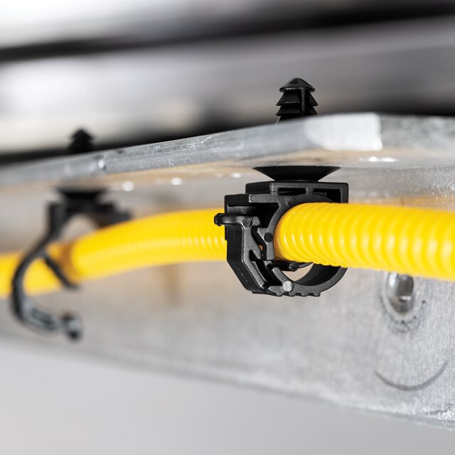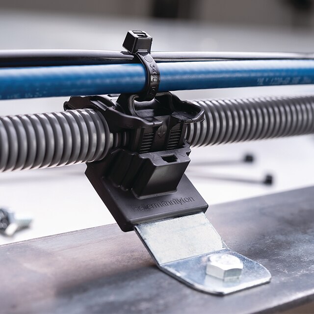 Mounts and routes bundles parallel or perpendicular to a panel edge. Convenient LOC quickly secures wires.