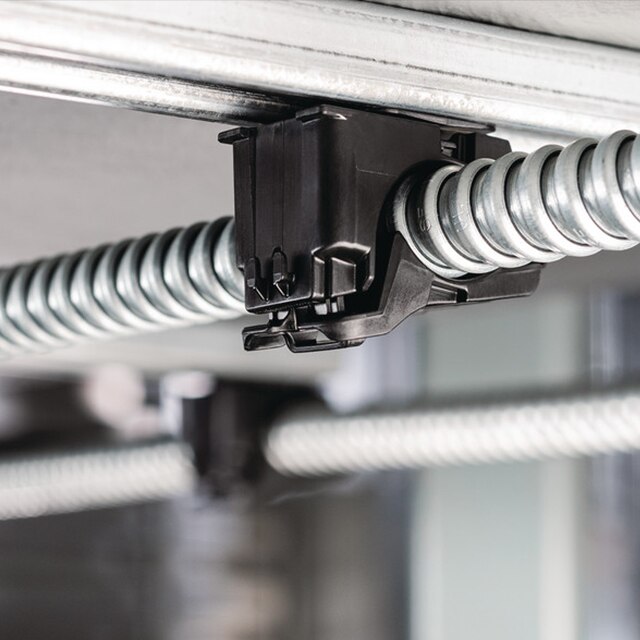 Clamp easily presses onto existing threaded studs; built-in gate prevents stud from touching bundle.