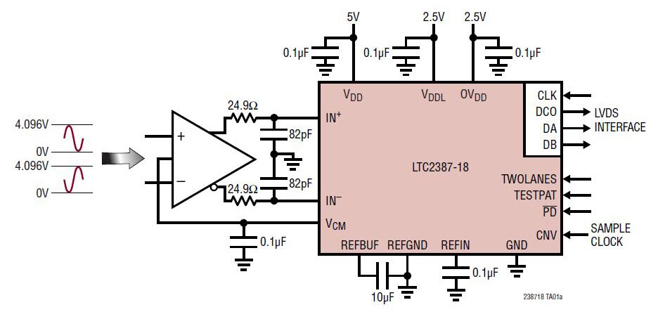 Analog Devices' LTC2387-18 is ideally suited for a wide range of applications. The combination of excellent linearity and wide dynamic range makes the LTC2387-18 ideal for high-speed imaging and instrumentation applications. No latency operation provides a unique solution for high-speed control loop applications. The very low distortion at high input frequencies enables communications applications requiring wide dynamic range and significant signal bandwidth.