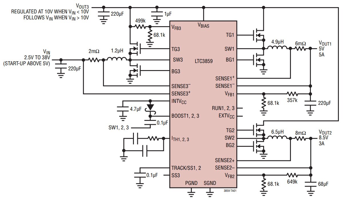 Analog Devices' LTC3859 is a high-performance triple output (buck/buck/boost) synchronous DC/DC switching regulator controller. This controller drives all N-channel power MOSFET stages. Constant frequency current mode architecture allows a phase-lockable switching frequency of up to 850 kHz. The LTC3859 operates from a wide 4.5 V to 38 V input supply range. When biased from the output of the boost converter or another auxiliary supply, the LTC3859 can operate from an input supply as low as 2.5 V after start-up.