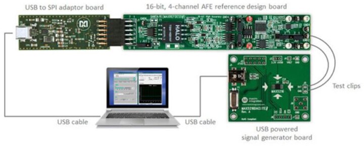 Analog Devices' MAXSANTAFEEVSYS kit allows users to quickly demonstrate and evaluate the functionality of the MAXREFDES5 4-channel 16-bit, isolated analog front-end (AFE) reference design without the need for a bench power supply, signal generator equipment, or Xilinx development kit. The reference design board connects to a PC through an included USB-to-SPI adapter that provides both power and data communication to the board. To test the AFE reference design, a USB-powered signal generator board utilizing one of Analog Devices' digital-to-analog converters (DAC) is also included. A Windows®-based graphical user interface (GUI) communicates with the boards for generating various analog signal test patterns and simplified access to AFE measurement data.