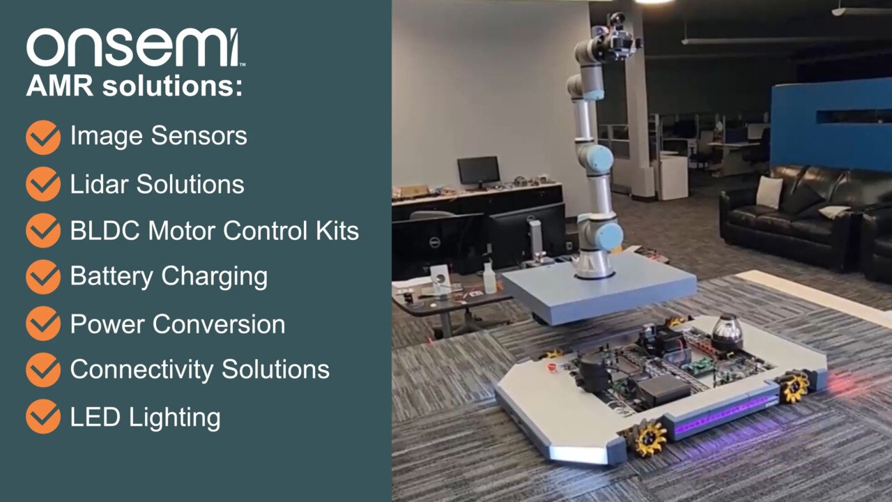 The onsemi Autonomous Mobile Robot concept is a comprehensive robotics solution designed with highly efficient and innovative solutions from onsemi. The concept can be used to design various types of Robots, Cobots, Power tools and Autonomous Guided Vehicles by combining different intelligent and power solutions from onsemi.