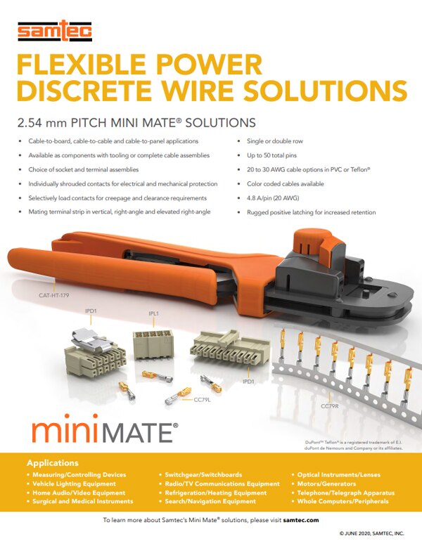 Samtec’s discrete wire solutions are available in pitches from 1 mm to 2.54 mm with wire ranges from 30 to 20 AWG. They are offered in a broad selection of bodies, contacts and terminals with rugged latching, high-reliability Tiger Eye™ or individually shrouded contact systems, polarization, keying and more.
