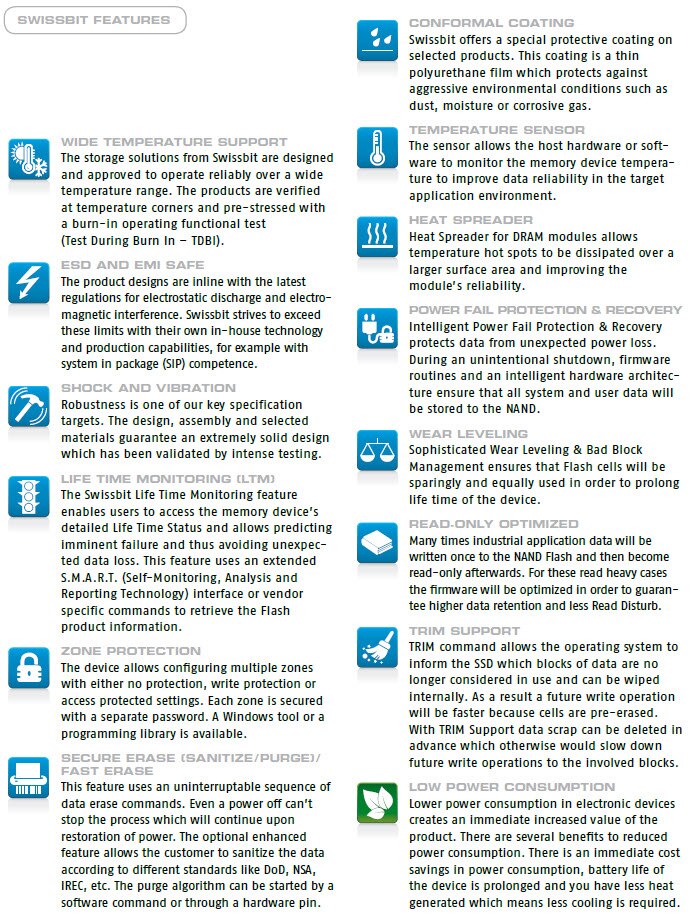 Swissbit® Memory & Storage SolutionsEmbedded and Industrial systems require a variety of memory and storage solutions. In contrast to typical consumer devices, Swissbit's Industrial Flash products are designed for highest reliability in extreme environmental conditions. They come with a large feature set tailored to the demand of the industrial market and with our commitment to long-term availability. Swissbit's Industrial Solid State Drive (SSD) portfolio covers all relevant interfaces and form factors including SD and MICRO SD Memory Cards, CompactFlash™ Cards (CFC), CFast™ Cards, 2.5” SATA, SLIM SATA SSDs, mSATA SSDs, M.2 SATA SSDd and USB Flash Drives (UFD). Our sophisticated Flash handling algorithms optimize performance and life time of the Single Level Cell (SLC) and Multi Level Cell (MLC) NAND Flash used in our products. SATA SSD 2.5" X-60 / X-600 Series![]() ![]() Swissbit’s industrial grade 2.5” SSDs are ideal solutions for embedded and networking/communication applications requiring Solid State storage in a rugged and high density form factor. The Swissbit SATA 6Gb/s durabit™ X-60 SSD with MLC technology and the counterpart X-600 in SLC technology offer highest endurance and sustained performance by combining a powerful controller with DRAM supported FTL and increased overprovisioning (MLC only). They achieve data transfer rates up to 520 MB/s in sequential access and 75,000 IOPS in 4KB random access. In addition, the X-60 / X-600 series feature Swissbit’s proven Power Fail Safety, ATA security feature set, NCQ, TRIM, advanced Wear Leveling & Bad Block management and in-field firmware update functionality. The Swissbit Life Time Monitoring tool provides detailed S.M.A.R.T. based status information for all Swissbit SSDs. ![]() *click to see the Property Legend