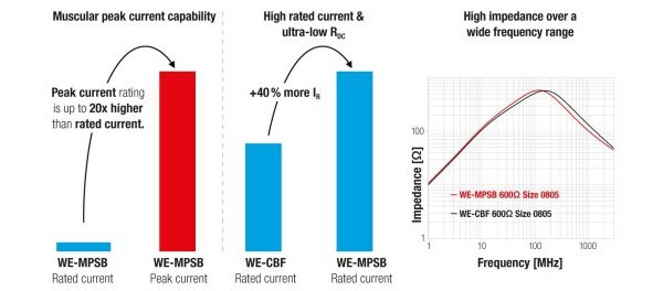 WE-MPSB optimizes high current vs. RDC performance with up to 75% RDC reduction in comparison to similar components while maintaining a high impedance over a wide frequency range.