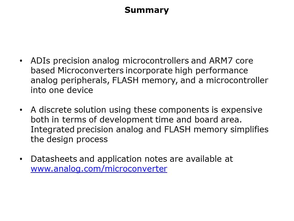 By integrating precision analog with FLASH memory and an ARM7TDMI core, the design process for the system designer is greatly simplified. All peripherals can simply be accessed by writing to a MMR (memory mapped register) within the ARM7TDMI core. The small size, low cost, and precision measurement capability of these devices make them particularly suitable for industrial, automotive, and communication applications.