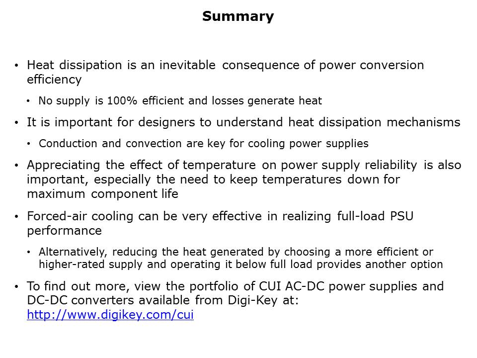 In summary, heat dissipation is an inevitable consequence of power conversion efficiency. Appreciating the effect of temperature on power supply reliability is important, especially the need to keep temperatures low for maximum component life. As has been discussed, the system designer has a number of options available when considering the thermal management of the power supply and the surrounding system. While effective, forced-air cooling is not always the ideal choice for system designers. By trading off power supply capacity against load, by selecting higher-efficiency designs or by moving to advanced products that employ conduction cooling, it is possible to achieve high performance with little to no acoustic noise through the use of non-forced air cooling. Alternatively, fans can be selected that minimize noise emissions and which provide thermal compatibility over a wide ambient temperature range.