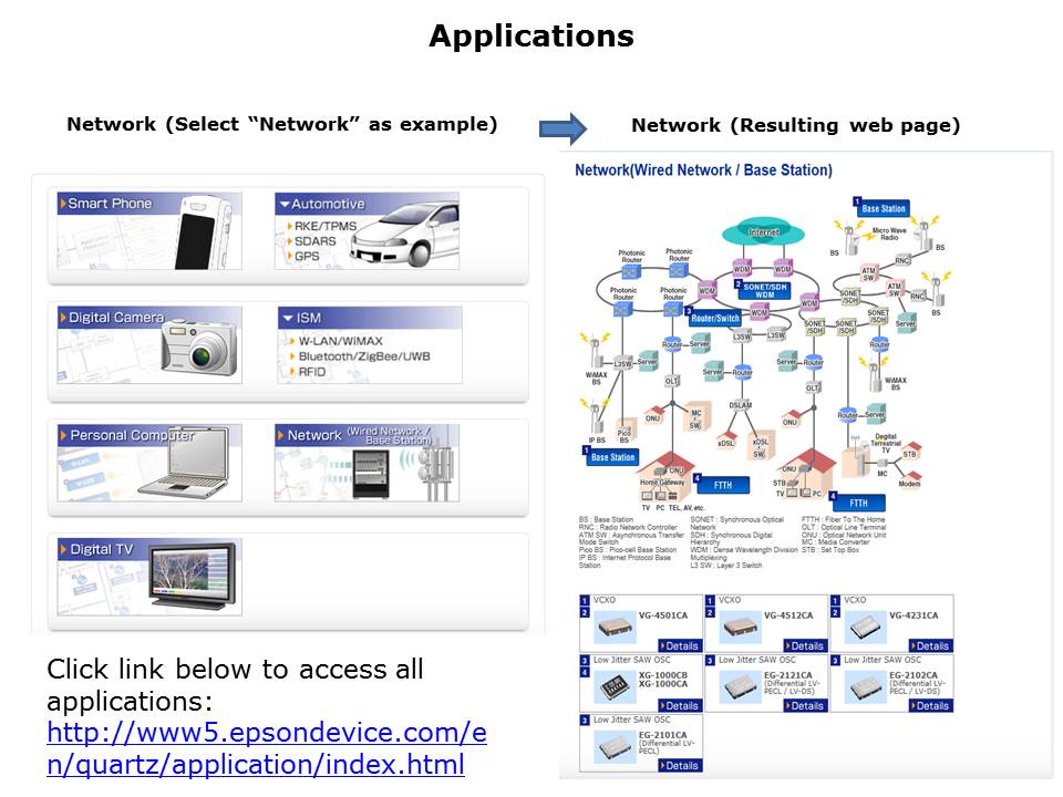 Timing devices like SPXOs and VCXOs can be found in all sorts of electronic applications. On Epson’s website, one may find the recommended timing devices categorized by the various features and functions of the associated application. Shown here is an example for a network application.