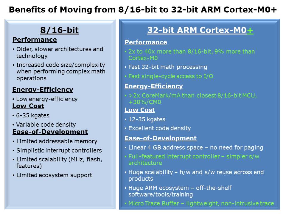 The new 32-bit ARM® Cortex™ M0+ core takes 8- and 16-bit designs to the next level by improving performance, energy efficiency, cost, and ease of development. Basically the M0+ is a low end version of the Cortex-M4 with up to 40x the performance of an 8-bit MCU and fast single-cycle access to I/O. It delivers more than 2x the energy efficiency of the closest competition, and a 30% improvement in CoreMark/mA over the original M0. The M0+ has a very simple core with similar number of gates to a 16-bit core allowing for very aggressive pricing targets. The device includes a full featured interrupt controller and Micro Trace Buffer, among other features, to make overall development easier and faster.
