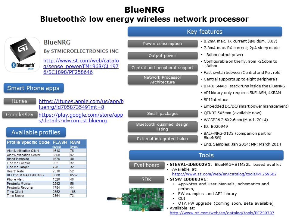 BlueNRG is an energy-efficient Bluetooth® 4.0 Low-Energy Single-Mode chip enabling longer runtimes and smaller, lighter batteries in a wide range of wireless “accessories” such as fitness wristbands, smart eyewear, or interactive clothing. It is compliant with Bluetooth specification v4.0. ST’s BlueNRG network processor provides the functions needed to link the Bluetooth Smart device to a Bluetooth Smart Ready host such as a smartphone or a tablet. BlueNRG features its own radio, processor, and Bluetooth firmware to simplify the wireless design, allowing engineers to concentrate on creating innovative applications. ST BlueNRG enables superior battery life and excellent wireless-link performance, allowing devices to operate for months or even years from a small coin-cell battery. In addition to low current consumption, BlueNRG also has frugal power management and can transition rapidly between operating modes, minimizing unproductive power. Moreover, BlueNRG gives designers flexibility to choose their preferred host microcontroller and comes with Bluetooth LE profiles to run in the external application processor. The on-chip non-volatile memory enables easy firmware upgrades to maintain future compliance. BlueNRG can act as master or slave, the Bluetooth LE stack runs on the embedded Cortex M0 core, and it offers the option of interfacing with external microcontrollers using SPI transport layer.