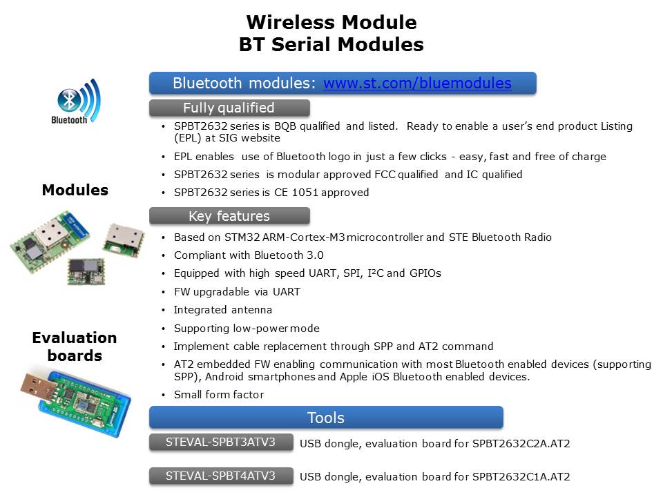ST’s latest Blue Module series offers a fast, flexible, and affordable Bluetooth solution on a highly reliable platform, based on the most advanced Bluetooth technology, supporting the Bluetooth specification V3.0 (Seattle). The Bluetooth stack is embedded in ST’s Blue Modules with the profiles, and a user-friendly application ensures a simple and effective way to use the modules via AT commands, a powerful application embedded in the Blue Modules that implements a user-friendly interface. The AT2 FW version enables communication with Android, smartphones and most Bluetooth enabled devices that support the serial port profile, however an external Apple authentication coprocessor and MFI certification are required for data communication with Apple iOS Bluetooth enabled devices. The SPBT2632C2A.AT2 and SPBT2632C1A.AT2 is an easy to use Bluetooth module which provides a complete RF platform. The SPBT2632C2A.AT2 enables electronic devices with wireless connectivity, not requiring any previous RF experience, optimizing time to market of the final applications. The module features fast-speed UART and seven general purpose I/O lines, several serial interface options, and up to 560 kbps transmission speed with SPP service active, 250 kbps with iAP service active. The optimized design allows the integration of a complete working Bluetooth modem, including antenna, in the minimum possible size, requiring only an additional external low power oscillator to enable low power mode capability.The SPBT2632CxA.AT2 is a surface mount PCB module that provides fully embedded, ready to use Bluetooth wireless technology. The reprogrammable Flash memory contains embedded firmware for serial cable replacement using the Bluetooth SPP profile. Embedded Bluetooth AT2 command firmware realizes a simple control for cable replacement, enabling communication with most Bluetooth enabled devices. The SPBT2632CxA.AT2, supporting iAP profile, provides communication with Android, smartphone, and Apple® iOS Bluetooth enabled devices. Customers using the Apple authentication IC, required to exchange data with an Apple device or to access an Apple device application, must register as developers to become an Apple certified MFI member. Certified MFI developers creating electronic accessories that connect to the iPod®, iPhone®, and iPad® can gain access to technical documentation, hardware components, technical support, and certification logos. Customized firmware for peripheral device interaction, power optimization, security, and other proprietary features may be supported and can be ordered pre-loaded and configured.