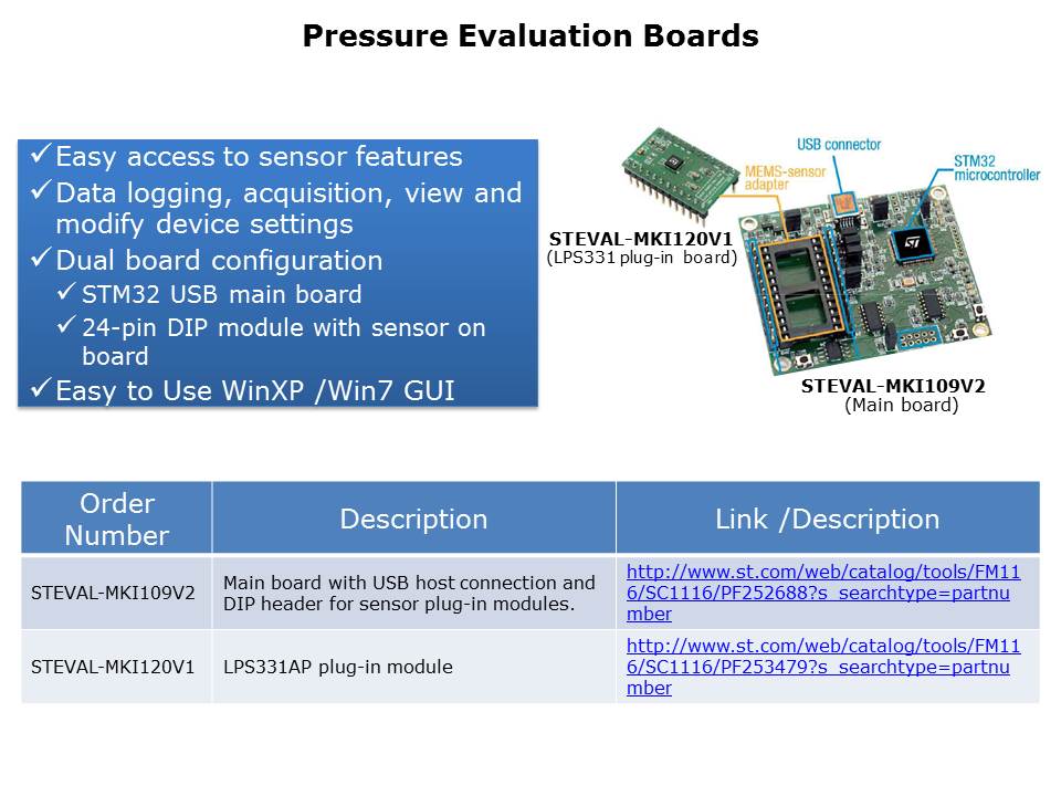 ST offers a modular dual evaluation board for easy access to sensor features such as device configuration, acquisition, data logging, and to view and modify device settings. The STEVAL-MKI109V2 is the STM32 USB-based main board which supports the pressure sensor as well as many other MEMS devices. The LPS331 pressure sensor plug-in module, as shown on this slide, is the STEVAL-MKI120V1. ST also provides the low level device drivers and a simple to use GUI which runs in Windows XP or Win7