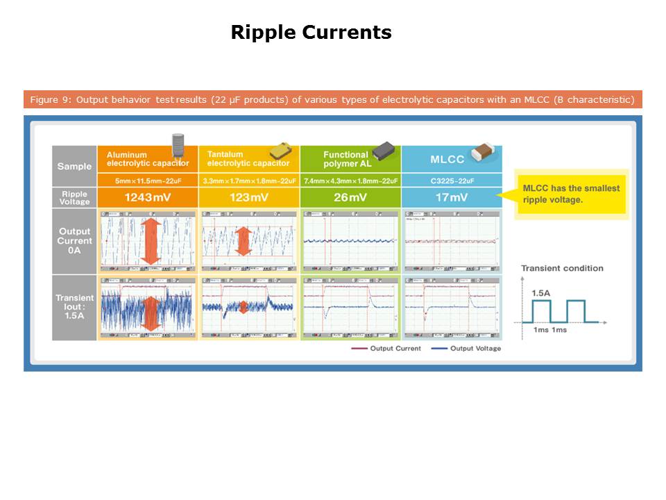 The output voltages of the step-down DC-DC converter's output capacitors were compared using the following type of evaluation board. The capacitors compared were a typical aluminum electrolytic capacitor, a tantalum electrolytic capacitor, a functional polymer aluminum electrolytic capacitor and an MLCC with an capacitance of 22 μF.