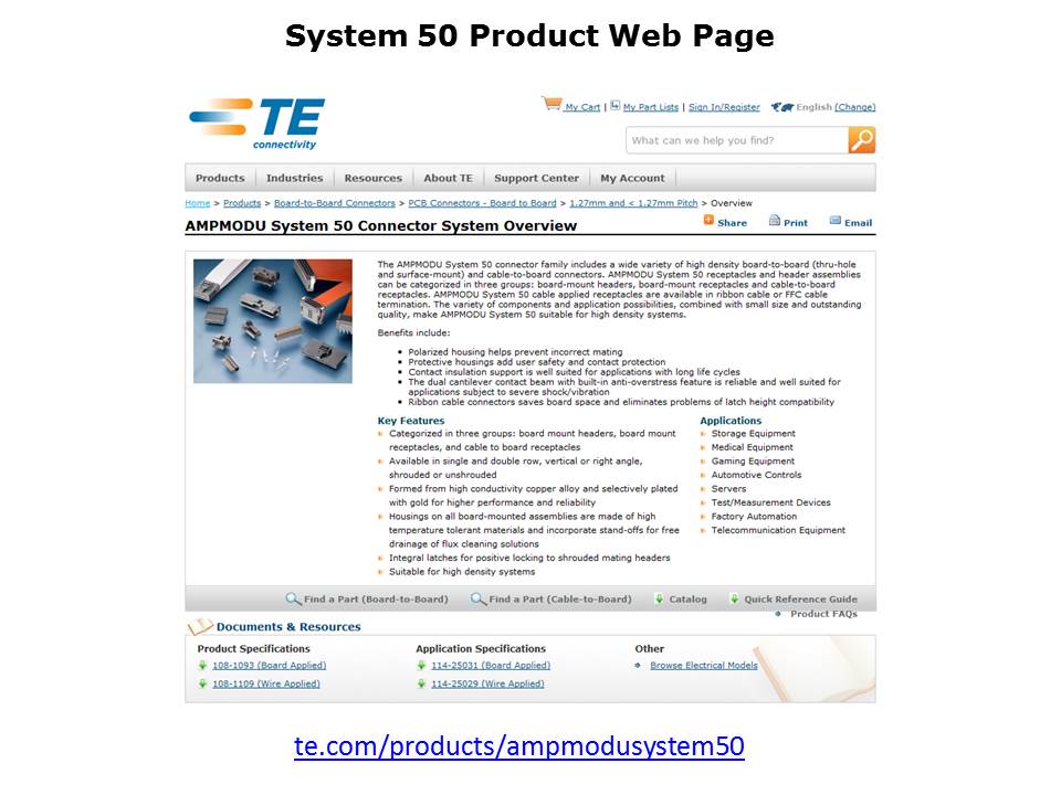 The most up to date information available for TE’s AMPMODU System 50 connector's can be found on their product web page. The web page provides a brief overview of the product, key features available, applications, and links to detailed information, such as catalogs, product presentations, customer drawings, 3D models, and product specifications.