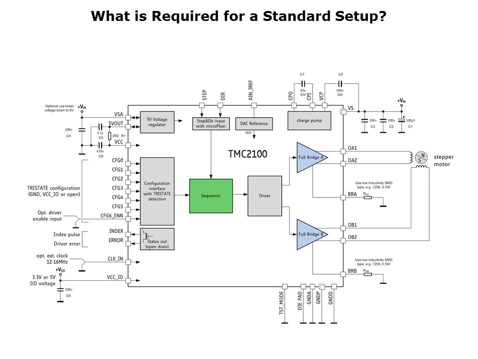 The TMC2100 may be used with 3.3 V as well as with 5 V I/Os. Connect a supply voltage to VCC_IO accordingly. For noise filtering use a 100 nF capacitor against ground. The power supply terminals should be filtered with 100 nF capacitors as a good practice. In case VSA uses the same supply voltage as VM, the additional capacitor at VSA may be left away. Sense resistors define the motor current. A variant without sense resistors is shown later on.
