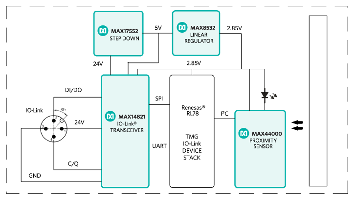 The MAXREFDES27# is a tiny IO-Link proximity sensor with an IR receiver, matching IR LED driver, IO-Link transceiver, and energy-efficient step-down converter all on an 8.2mm x 31.5mm printed circuit (PC) board. Maxim Integrated and Technologie Management Gruppe Technologie und Engineering (TMG TE) collaborated in designing the MAXREFDES27# as an IO-Link version 1.1/1.0 compliant proximity sensor reference design. The MAXREFDES27# design consists of an industry standard Maxim Integrated IO-Link device transceiver (MAX14821), a tiny low-dropout linear regulator (MAX8532), an efficient high-voltage step-down converter (MAX17552), a Renesas ultra-low-power 16-bit microcontroller (RL78) utilizing TMG TE's IO-Link device stack, and a Maxim Integrated proximity sensor (MAX44000).